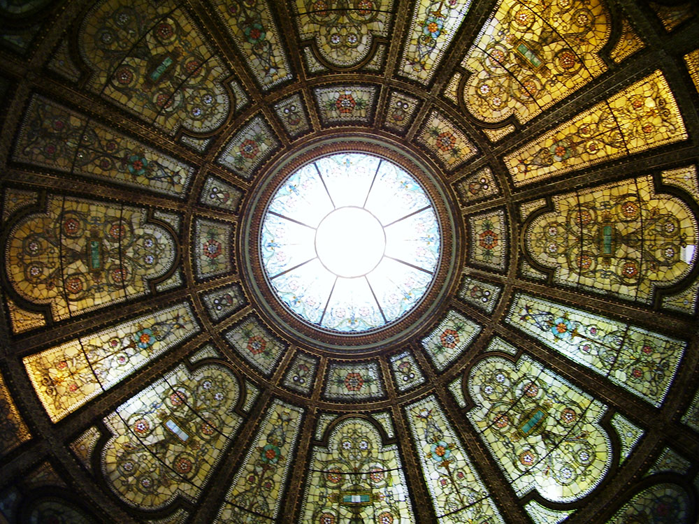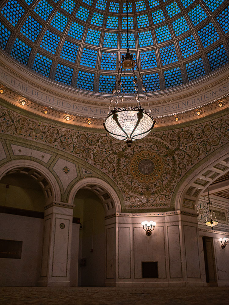 Preston Bradley Hall - A large, ornately patterned room of curving white Carrara marble, capped with an austere 38-foot Tiffany glass dome designed by artist J. A. Holzer. The Cultural Center states this to be the largest Tiffany dome in the world.