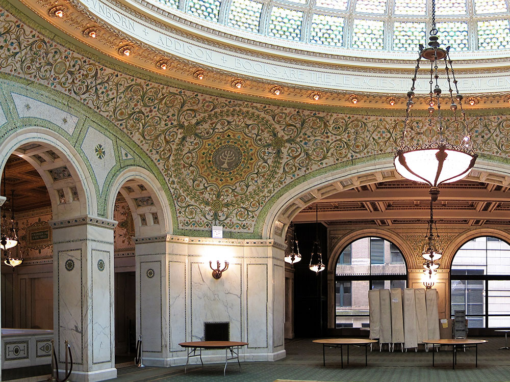 The building was designed by Boston architectural firm Shepley, Rutan and Coolidge for the city's central library, and Grand Army of the Republic (GAR) meeting hall and memorial in 1892. The land was donated by the GAR and the building was completed in 1897 at a cost of nearly $2 million (equivalent to $62.22 million in 2020). It is organized as a 4-story north wing (77 East Randolph entrance) and a 5-story south wing (78 East Washington entrance), 104 feet tall, with 3-foot-thick (0.91 m) masonry walls faced with Bedford Blue Limestone on a granite base, and designed in a generally neoclassical style with Italian Renaissance elements. It is capped with two stained-glass domes, set symmetrically atop the two wings. Key points of architectural interest are as follows: