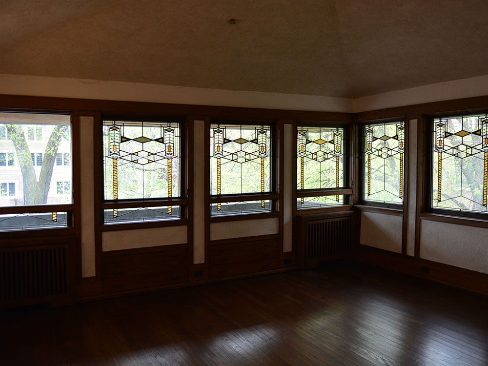 The third floor overlaps the major and minor vessels in the center of the building. Wright referred to the third floor as the "belvedere," the "place in command of beautiful views." The south side of the third floor contains the master bedroom, dressing area, a full bathroom, and, through a small closet and an art glass door, a balcony facing south and west. Two additional bedrooms and a full bathroom are located on the north side of this floor. All of the windows on this level contain art glass panels. Dresser drawers are built into the walls of the bedrooms underneath the windows, and project into the eave spaces.