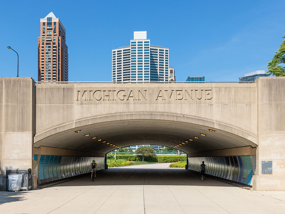 A section of the Chicago Lakefront Trail, an 18-mile multi-use path along the city's Lake Michigan shoreline, runs through the park's eastern edge. The trail runs adjacent to Lake Shore Drive from Randolph Drive to Balbo Drive, then along the very edge of the seawall around the Shedd Aquarium. An underpass carries the trail under Solidarity Drive into Burnham Park.