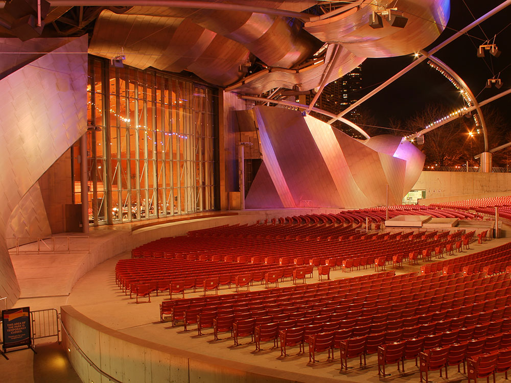 The centerpiece of Millennium Park is the Jay Pritzker Pavilion, a bandshell designed by Frank Gehry. The pavilion has 4,000 fixed seats, plus additional lawn seating for 7,000; the stage is framed by curving plates of stainless steel, characteristic of Gehry. It was named after Jay Pritzker, whose family is known for owning Hyatt Hotels and was a major donor. The Pritzker Pavilion is Grant Park's outdoor performing arts venue for small events, and complements Petrillo Music Shell, the park's older and larger bandshell. The pavilion is built partially atop the Harris Theater for Music and Dance, the park's indoor performing arts venue, with which it shares backstage facilities.