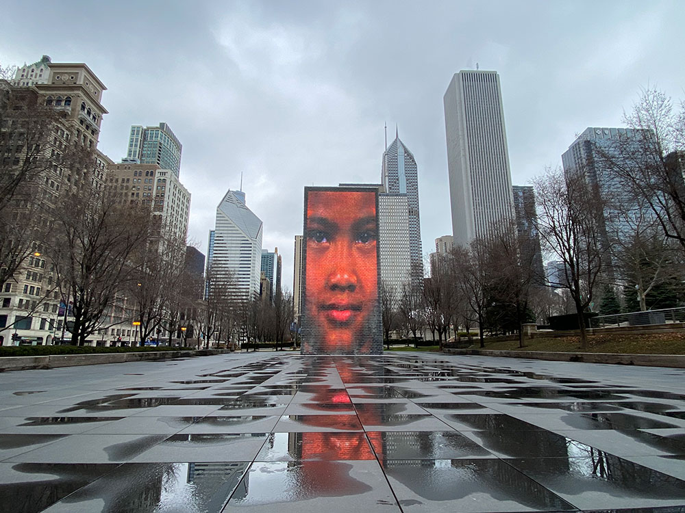 The Crown Fountain is an interactive work of public art and video sculpture, named in honor of Chicago's Crown family and opened in July 2004. It was designed by Catalan conceptual artist Jaume Plensa and executed by Krueck and Sexton Architects.[87][88] The fountain is composed of a black granite reflecting pool placed between a pair of transparent glass brick towers. The towers are 50 feet (15 m) tall, and use light-emitting diodes behind the bricks to display digital videos on their inward faces.