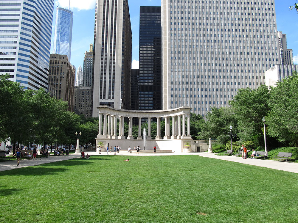 Wrigley Square is a public square located in the northwest corner of Millennium Park near the intersection of East Randolph Street and North Michigan, across from the Historic Michigan Boulevard District. It contains the Millennium Monument, a nearly full-sized replica of the semicircle of paired Greek Doric-style columns (called a peristyle) that originally sat in this area of Grant Park between 1917 and 1953. The square also contains a large lawn and a public fountain. The William Wrigley, Jr. Foundation contributed $5 million for the monument and square, which was named in its honor.
