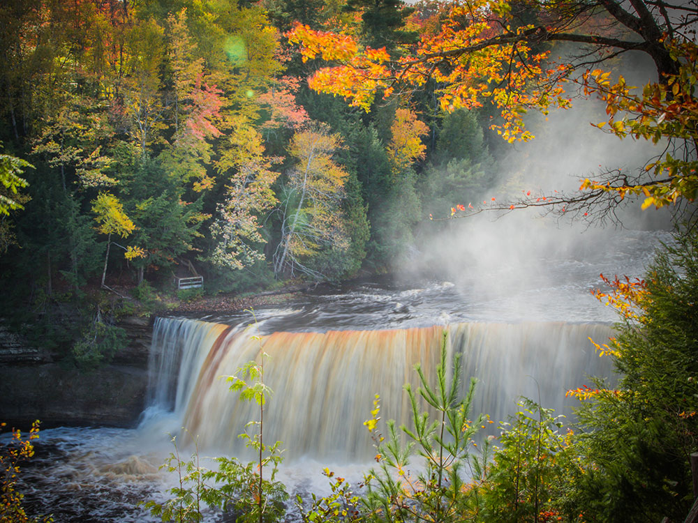 Tahquamenon Falls is also called Rootbeer Falls because of its golden-brown color, caused by tannins from cedar swamps that drain into the river. In winter, the ice that accumulates around and in the falls is often colored in shades of green and blue.