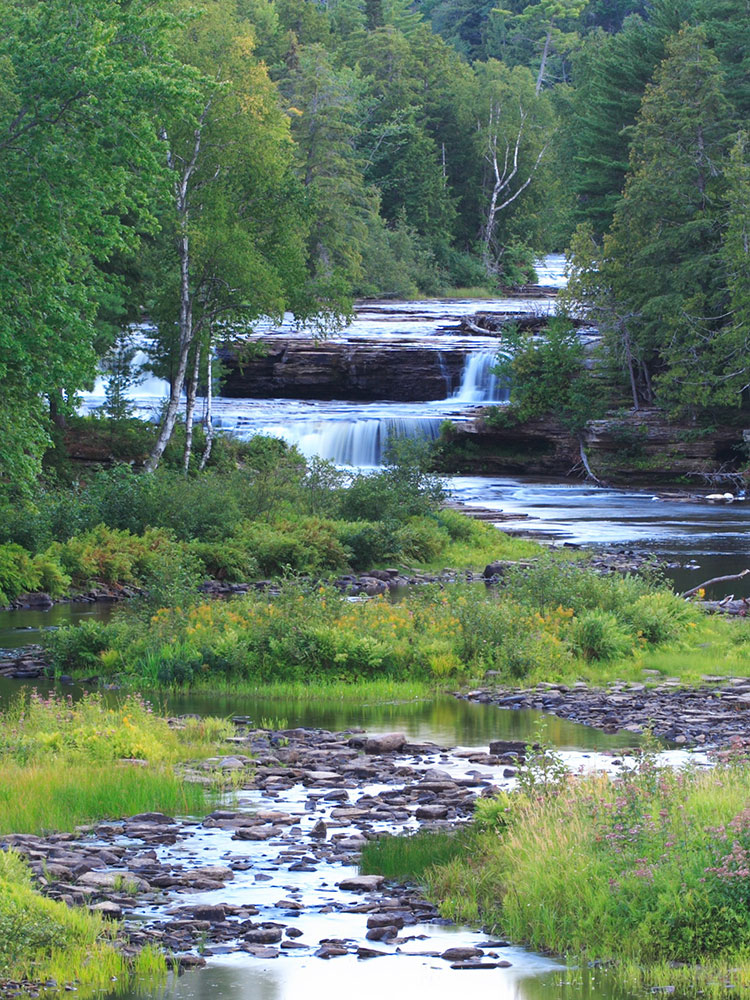 State Park that follows the Tahquamenon River as it passes over Tahquamenon Falls which include a single 50-foot drop, the Upper Falls, plus the cascades and rapids collectively called the Lower Falls