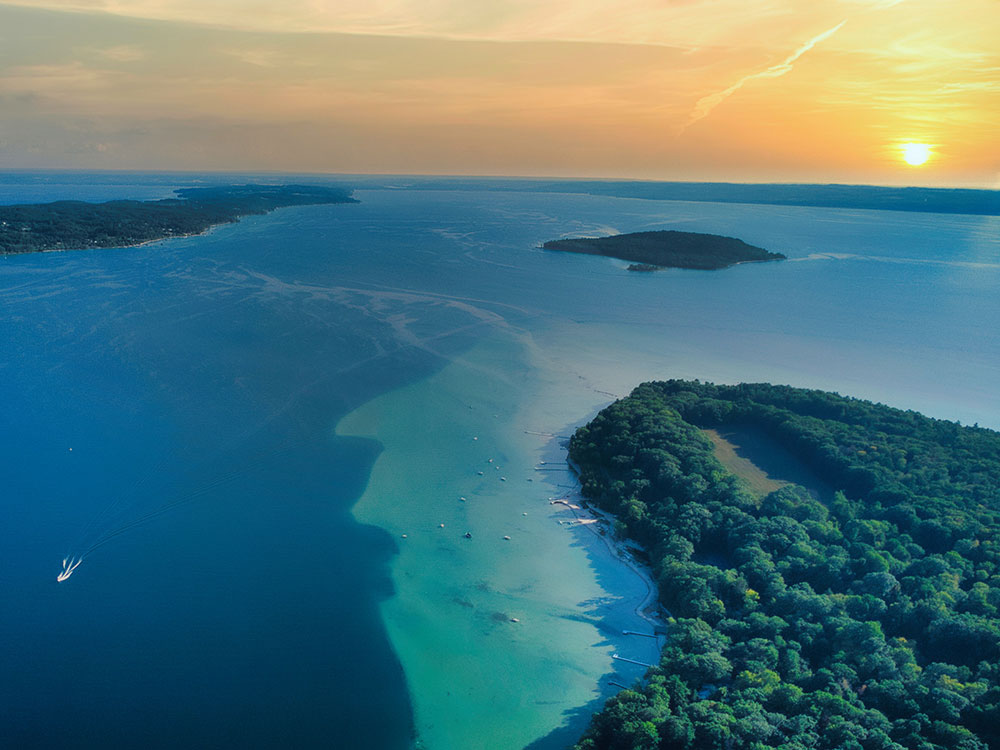 Traverse City is a part of the greater Northern Michigan region. The city is the main inland port of the Grand Traverse Bay—a long, natural harbor separated from the waters of Lake Michigan by the Leelanau Peninsula, and divided longitudinally almost evenly by a narrow peninsula of tiered hillsides and farmland called Old Mission Peninsula.