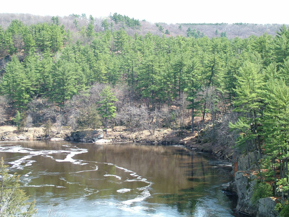 Two adjacent state parks on the Minnesota-Wisconsin border straddling the Dalles of the St. Croix River, a deep basalt gorge with glacial potholes and other rock formations