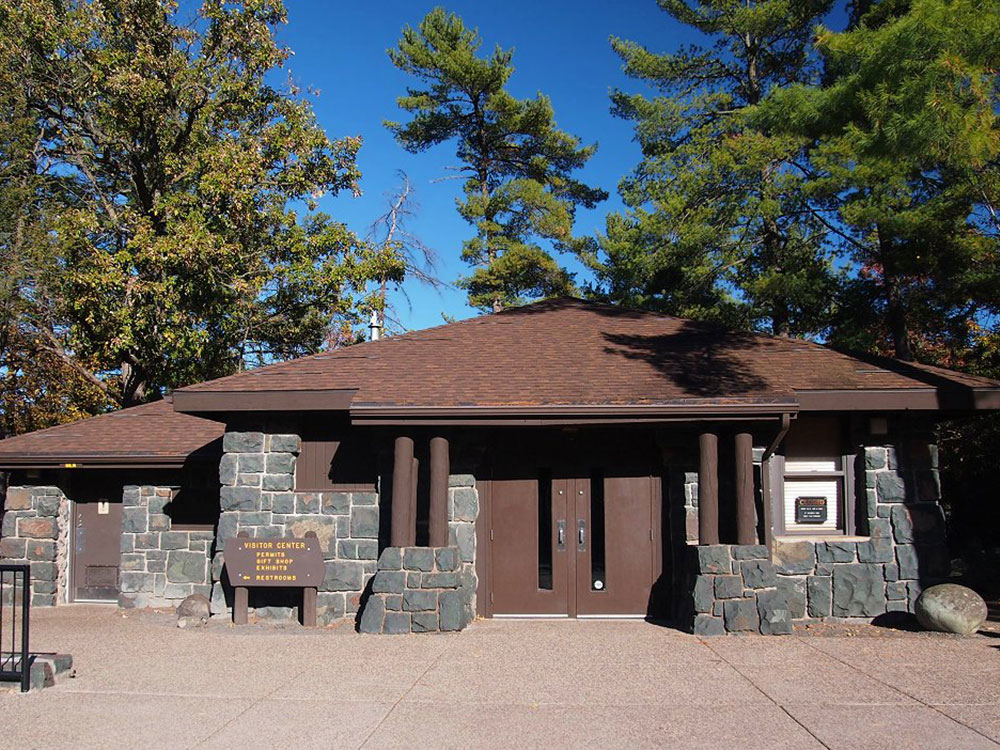 Interstate Park comprises two adjacent state parks on the Minnesota-Wisconsin border, both named Interstate State Park. They straddle the Dalles of the St. Croix River, a deep basalt gorge with glacial potholes and other rock formations. The Wisconsin park is 1,330 acres (538 ha) and the Minnesota park is 298 acres (121 ha). The towns of Taylors Falls, Minnesota and St. Croix Falls, Wisconsin are adjacent to the park. Interstate Park is within the Saint Croix National Scenic Riverway and the Ice Age National Scientific Reserve. The western terminus of the Ice Age National Scenic Trail is on the Wisconsin side. On the Minnesota side, two areas contain National Park Service rustic style buildings and structures that are listed on the National Register of Historic Places.