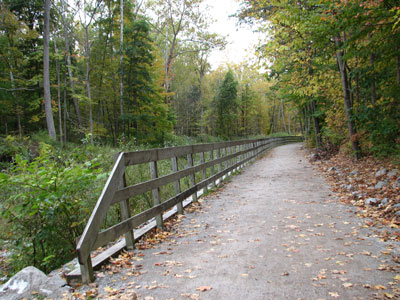 The park has many trails, most notably the 20-mile (32 km) Towpath Trail, which follows a former stretch of the 308-mile (496 km) Ohio and Erie Canal and is popular for hiking, bicycling, and running. Skiing and sled-riding are available during the winter at Kendall Hills. Visitors can play golf, or take scenic excursions and railroad tours on the Cuyahoga Valley Scenic Railroad during special events.