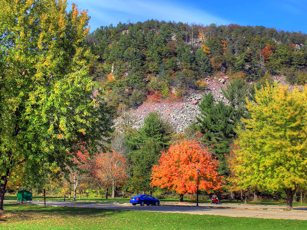 There are many quartzite rock formations, such as Balanced Rock and Devil's Doorway, throughout the park. Effigy mounds are also located throughout the park. The park contains approximately eleven miles of the 1,200-mile (1,900 km) Ice Age Trail. Its scenic beauty, along with its proximity to the Wisconsin Dells, has made it one of the most popular of Wisconsin's state parks for both day use and overnight camping; the park receives over three million visitors annually. During the fall, the park's brilliant foliage makes it a popular attraction. Parfrey's Glen, Wisconsin's first state natural area, is managed by the Devil's Lake State Park and located just east of the park.