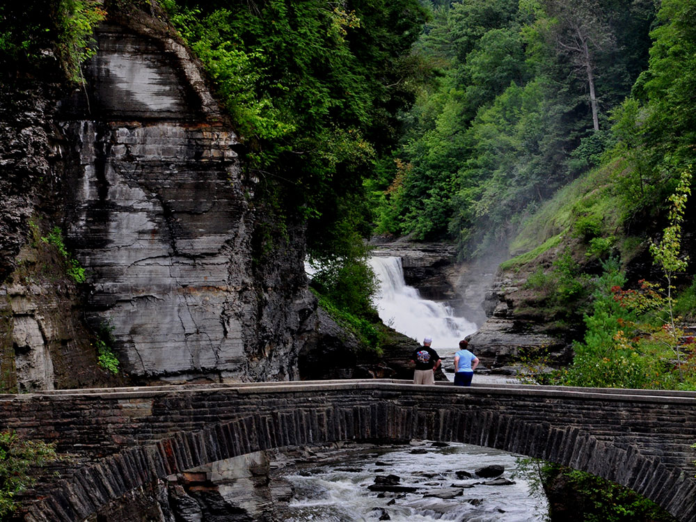 Within the park, there are three large waterfalls on the Genesee River and as many as 50 waterfalls found on tributaries that flow into it; the deep gorge formed by the river, with rock walls rising up to 550 feet (170 m) in places and which narrow to 400 feet (120 m) across above the middle of the three falls, prompted the area's reputation as the "Grand Canyon of the East". The three major waterfalls — called the Upper, Middle, and Lower Falls — are located in Portage Canyon, the southern section of the park. The only trail bridging the Genesee River in the park crosses a stone bridge just below the Lower Falls. The Middle Falls is the highest, and the Upper Falls has an active railroad trestle crossing immediately above it.
