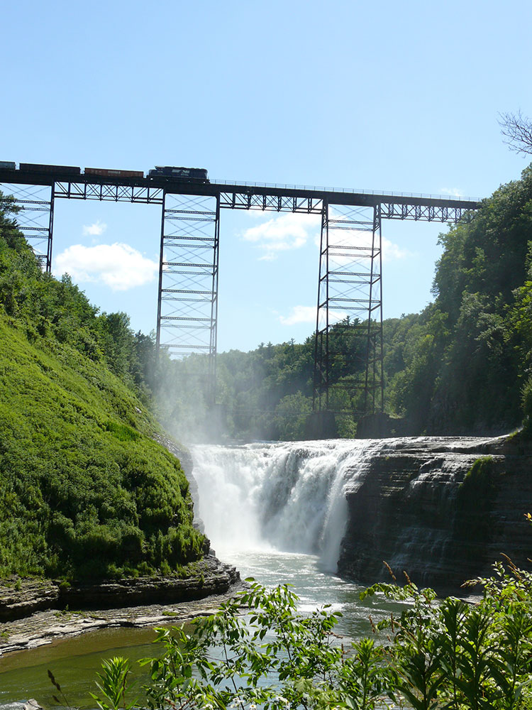 The Portage Viaduct is an iron railroad bridge located upstream and within view of the park's Upper Falls. The bridge is 820 feet (250 m) long and 240 feet (73 m) high. Although walking on the structure is considered trespassing, visitors to the park commonly disregard warning signs in order to view the gorge from the bridge, despite the safety concerns associated with walking on an active railroad bridge.