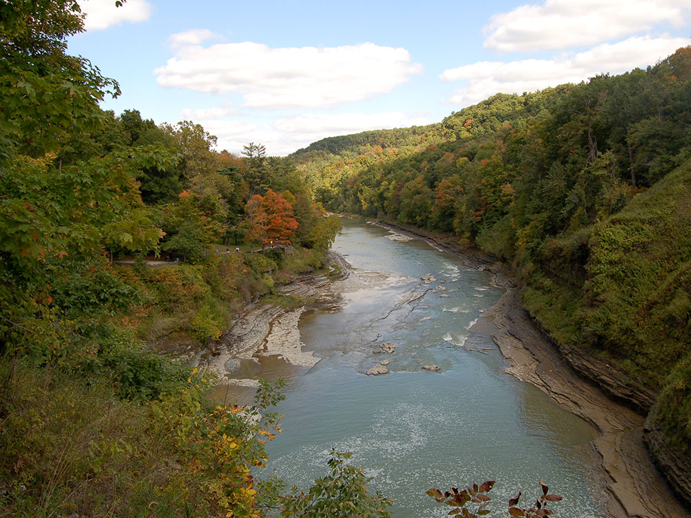 The bedrock exposed in the gorge is Devonian in age, mostly shales, with some layers of limestone and sandstone. The rock was laid down in an ancient inland sea, and it holds many marine fossils. The landform of the section of the Genesee River valley represented by the park is geologically very young, caused by a diversion of the river from the old valley by the last continental glacier, which forced the river to cut a new section of valley.