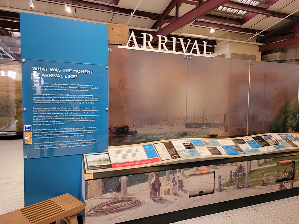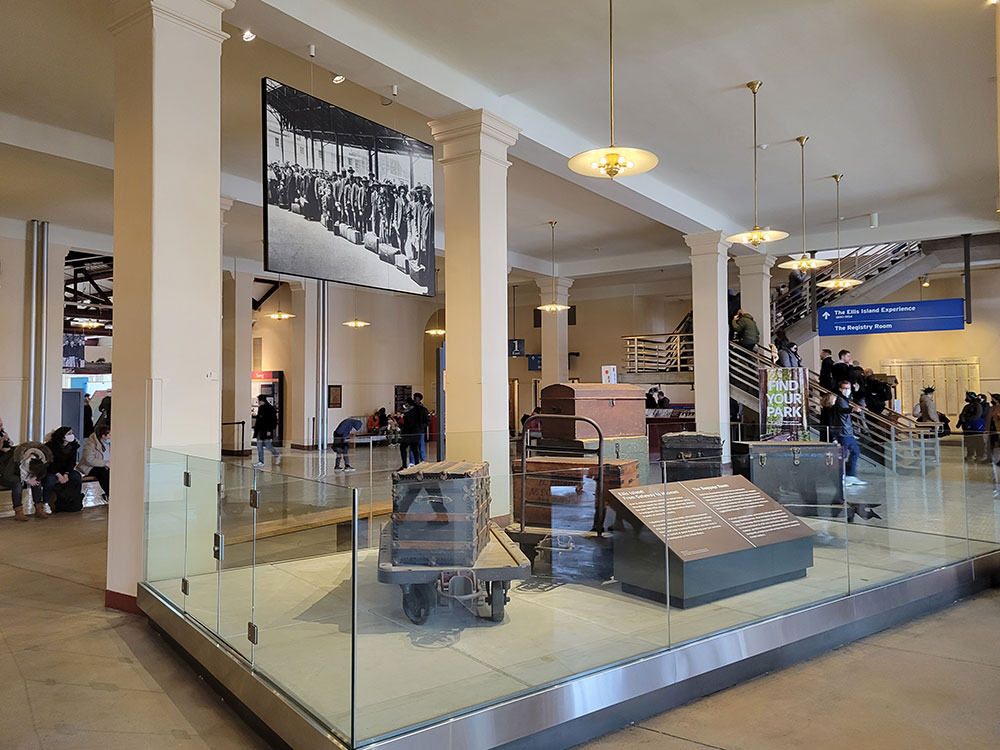 The Ellis Island Immigration Museum opened on September 10, 1990, replacing the American Museum of Immigration on Liberty Island, which closed in 1991. The museum contains several exhibits across three floors of the main building, with a first-floor expansion into the kitchen-laundry building.The first floor houses the main lobby within the baggage room, the Family Immigration History Center, Peopling of America, and New Eras of Immigration. The second floor includes the registry room, the hearing room, Through America's Gate, and Peak Immigration Years. The third floor contains a dormitory room, Restoring a Landmark, Silent Voices, Treasures from Home, and Ellis Island Chronicles, as well as rotating exhibits. There are also three theaters used for film and live performances. The third floor contains a library, reading room, and "oral history center", while the theaters are located on the first and second floors. There are auditoriums on all floors. On the ground floor is a gift shop and bookstore, as well as a booth for audio tours.