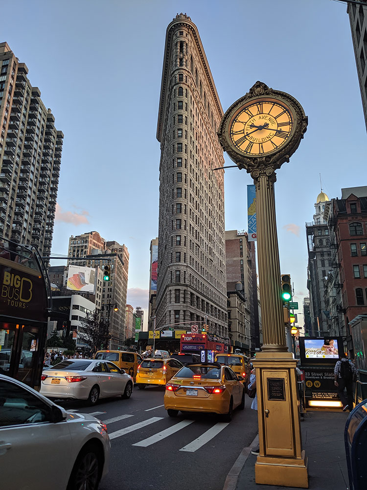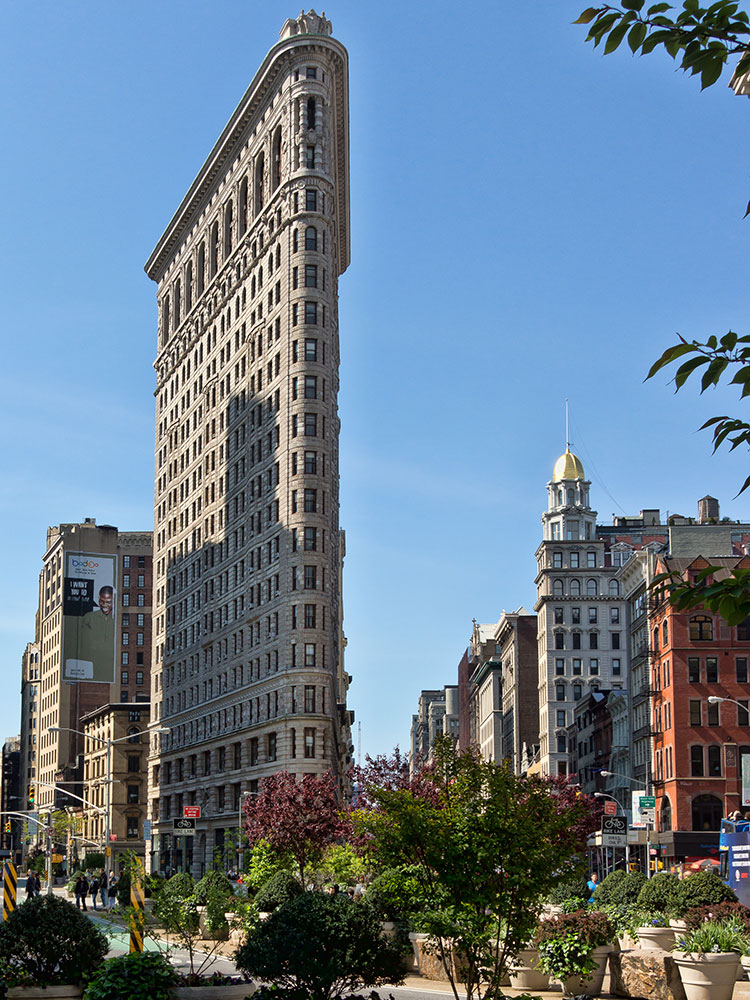 Triangular 22-story, 285-foot-tall (86.9 m) steel-framed landmarked building located in the eponymous Flatiron District neighborhood of Manhattan
