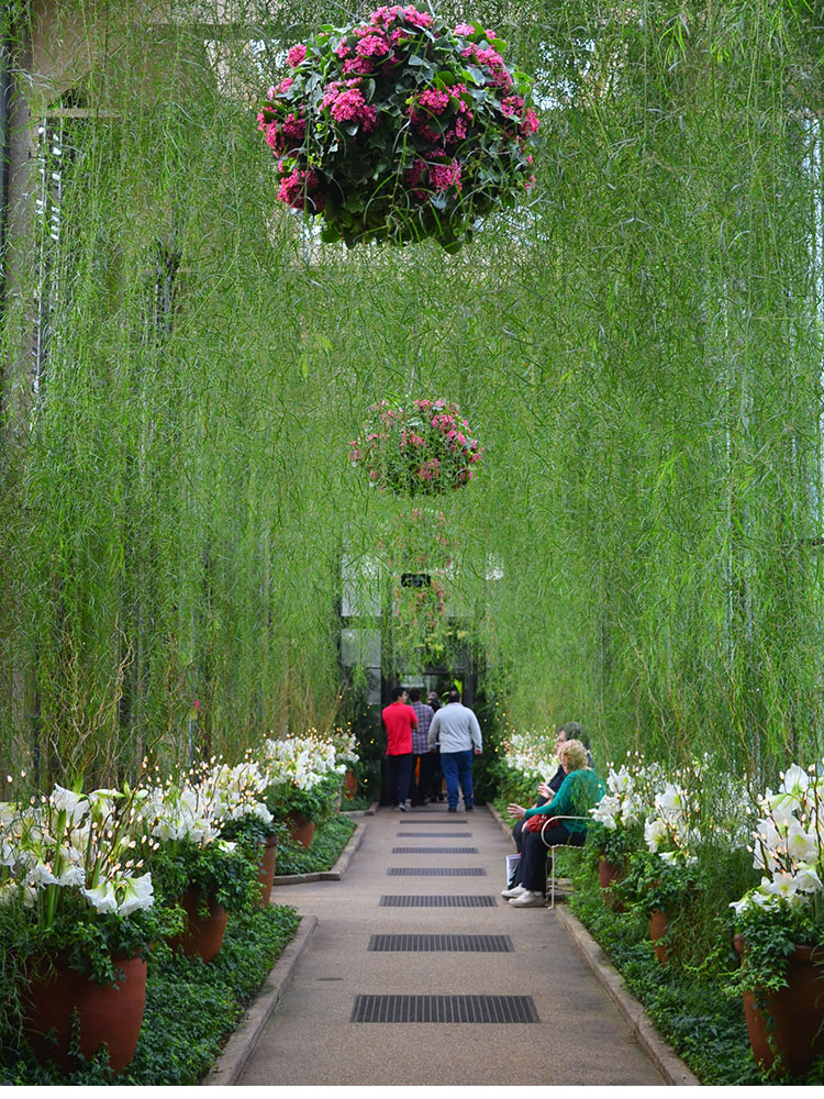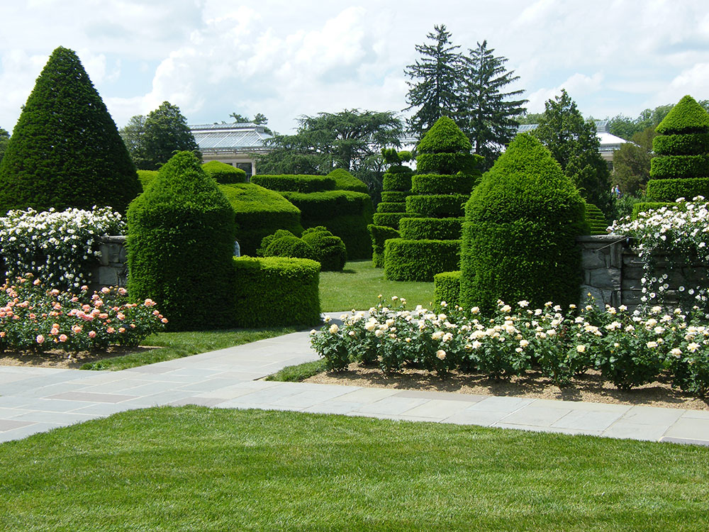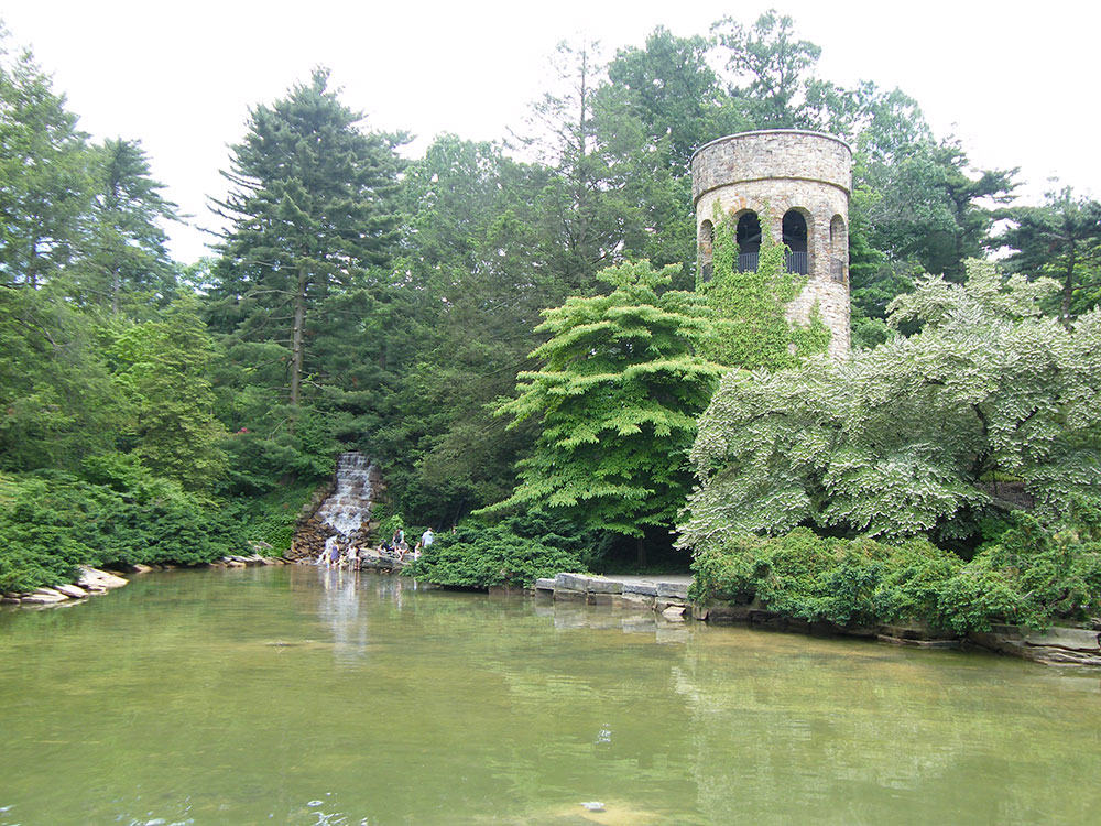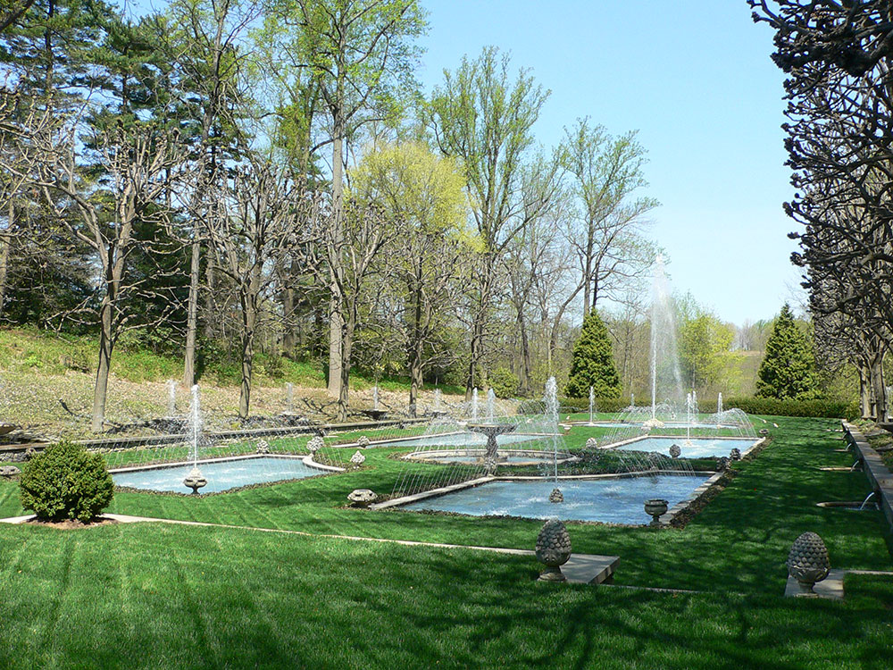 Outdoor gardens and garden features include: Birdhouse Treehouse, Canopy Cathedral Treehouse, Caryopteris Allée, Children's Corner, Chimes Tower and Waterfall, Cow Lot, East Conservatory Plaza, Flower Garden Drive, Flower Garden Walk, Forest Walk, Hillside Garden, Idea Garden, Italian Water Garden, Large and Small Lake, Lookout Loft Treehouse, Main Fountain Garden, Meadow Garden, Oak and Conifer Knoll, Peirce's Park, Peirce's Woods, Peony Garden, Rose Arbor, Rose Garden, Student Exhibition Garden, Theatre Garden, Topiary Garden, Trial Garden, Waterlily Display, and Wisteria Gardens.