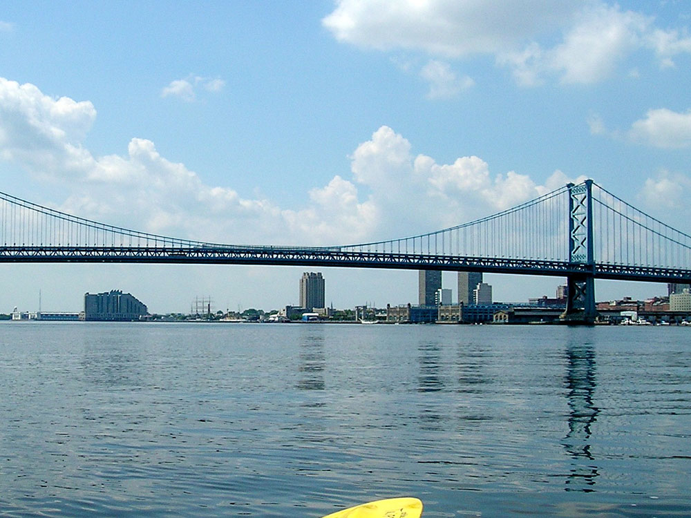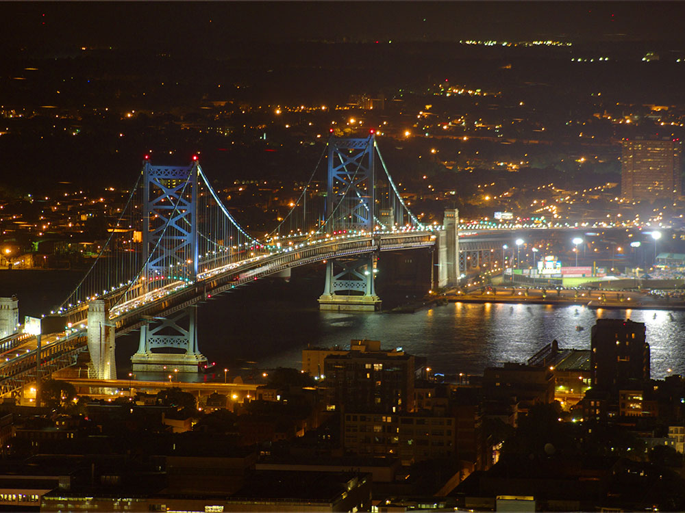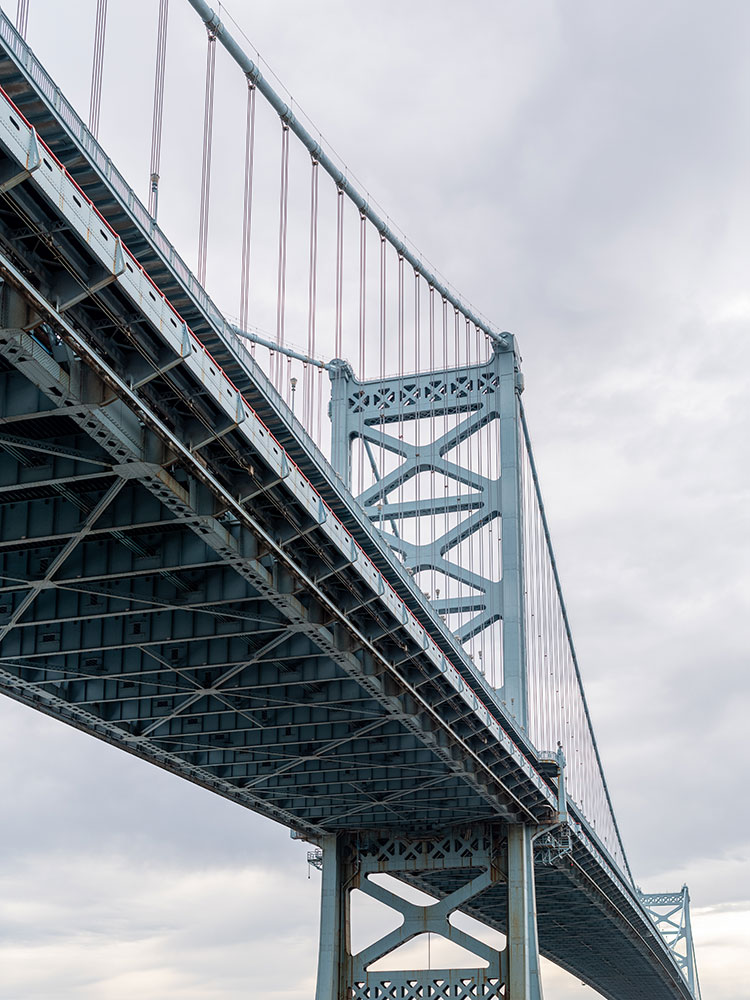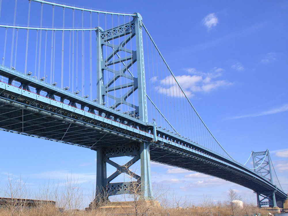 Suspension bridge across the Delaware River connecting Philadelphia, and Camden, New Jersey with pedestrian walkways running along both sides of the bridge