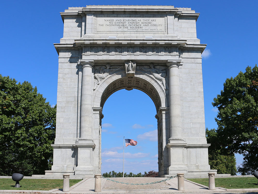 The drive is lined with large (~2 m high) memorial stones for each of the brigades, or "lines", that encamped there. Crossing Gulph Road at the arch, the drive proceeds through the Pennsylvania Columns and past the hilltop statue of Anthony Wayne on horse. More brigade stones line Port Kennedy Road.