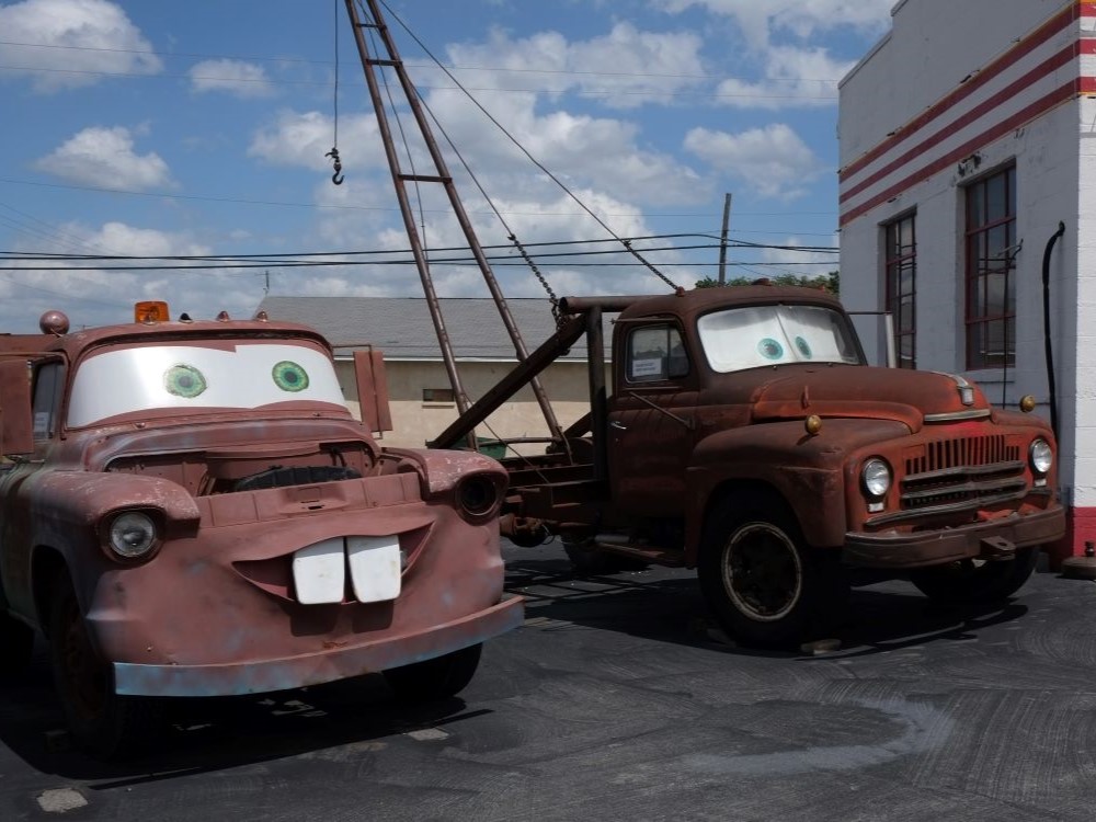 Restored 1930s service station offering Route 66 memorabilia, snacks, and photo ops with vehicles that inspired characters from a beloved animated film.