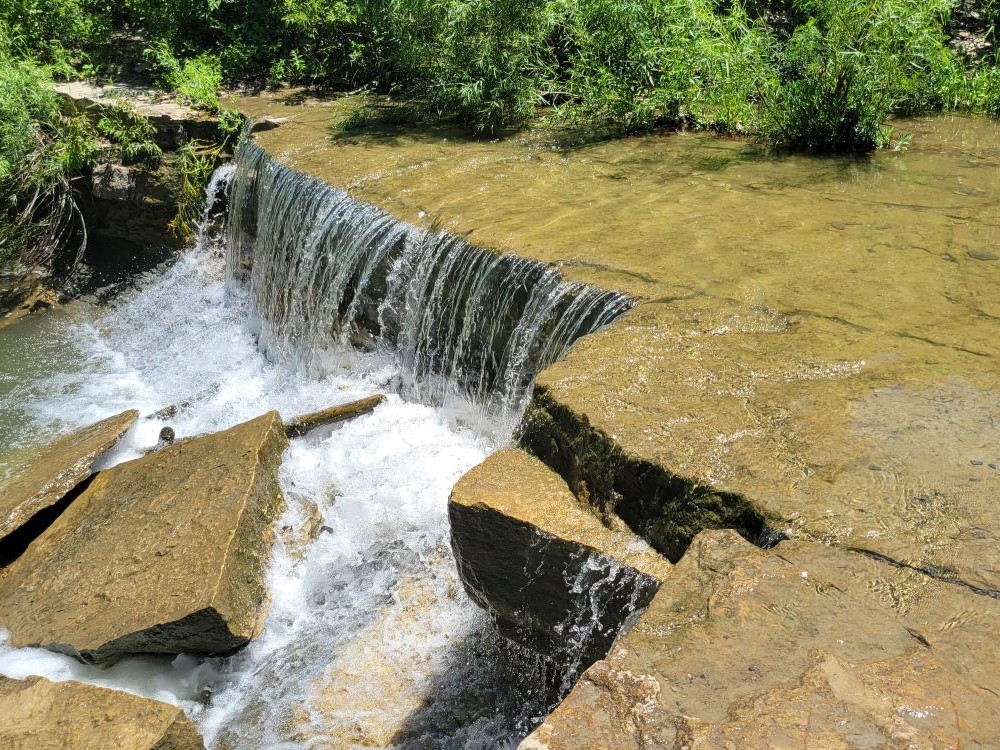 Multi-tiered waterfall cascading from a lake spillway into a scenic creek bed, surrounded by native prairie and accessible via a short hiking trail.