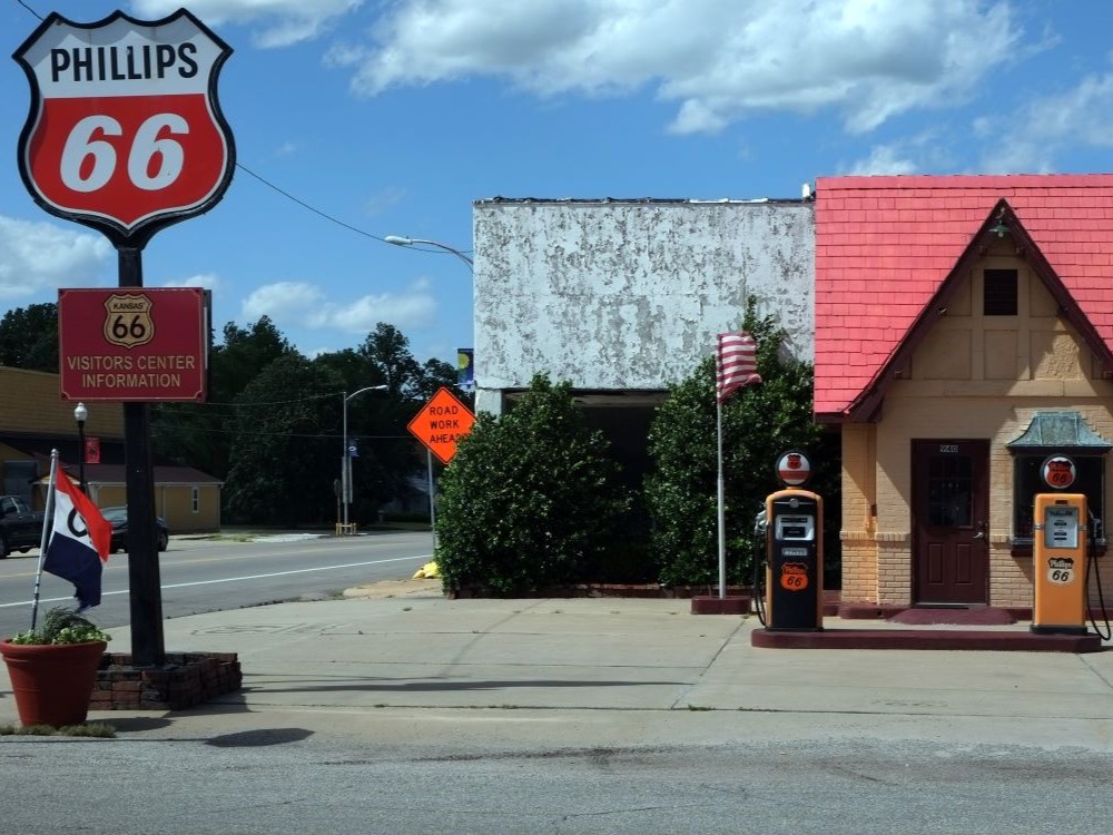 This article uses material from the Wikipedia articles and official tourism pages for Kansas Route 66 Visitors Center, which are released under the Creative Commons Attribution-Share-Alike License 3.