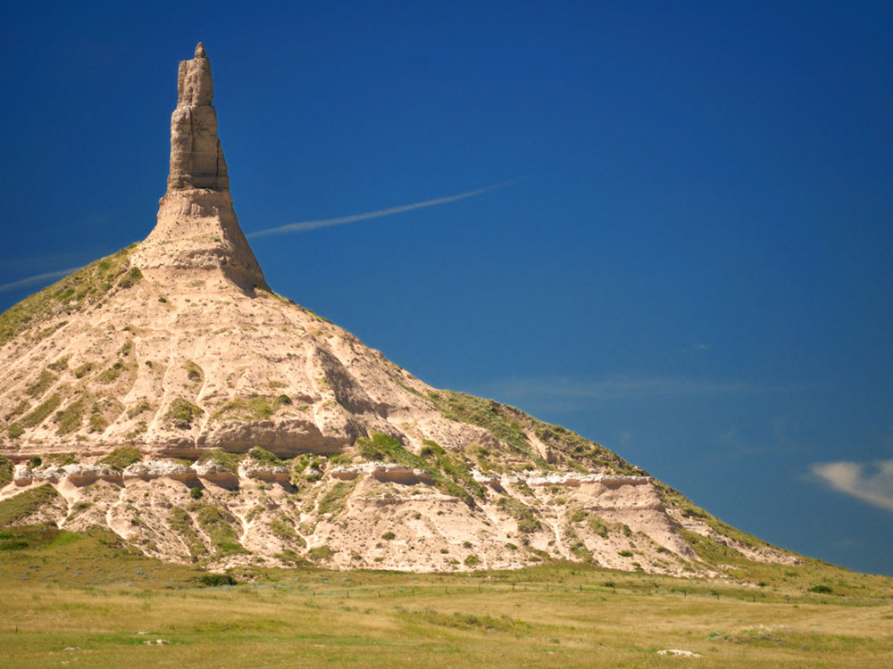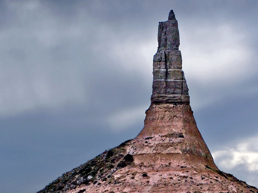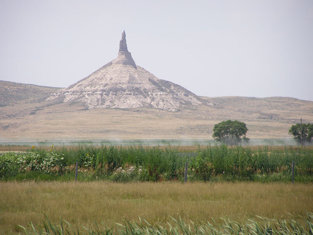 Chimney Rock is a prominent geological rock formation in Morrill County in western Nebraska. Rising nearly 300 feet (91 m) above the surrounding North Platte River valley, the peak of Chimney Rock is 4,228 feet (1,289 m) above sea level. The formation served as a landmark along the Oregon Trail, the California Trail, and the Mormon Trail during the mid-19th century. The trails ran along the north side of the rock, which remains a visible landmark for modern travelers along U.S. Route 26 and Nebraska Highway 92. Chimney Rock National Historic Site was designated in 1956 and is an affiliated area of the National Park Service, operated by History Nebraska.