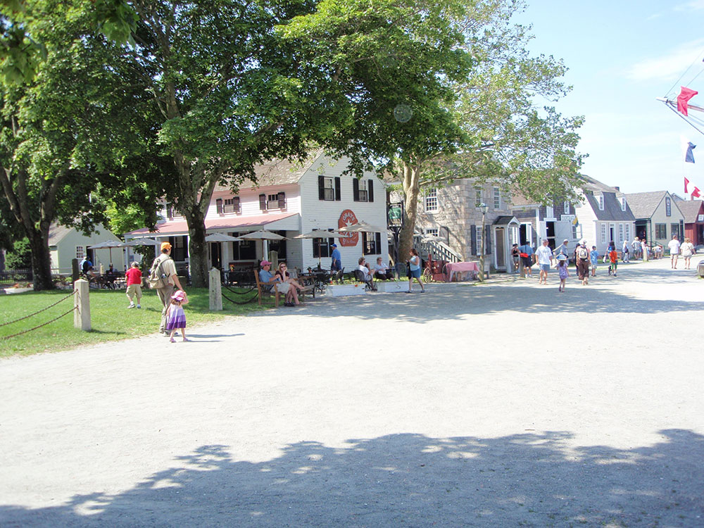 The 19th-century seafaring village contains nearly all the types of general and specialized trades associated with building and operating a sailing fleet. They include a chandlery, sail loft, ropewalk, cooperage, shipping agent's office, printing office, bank, and others. Also included is The Spouter Tavern, open seasonally and serving "travelers' fare". Each building is used both to show the original activity and to display examples of what was sold or constructed; the nautical instrument shop, for example, displays sextants, nautical timepieces, and so forth, while demonstrations at the cooperage show how casks are assembled.