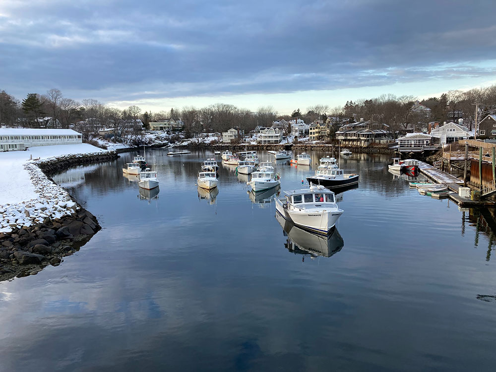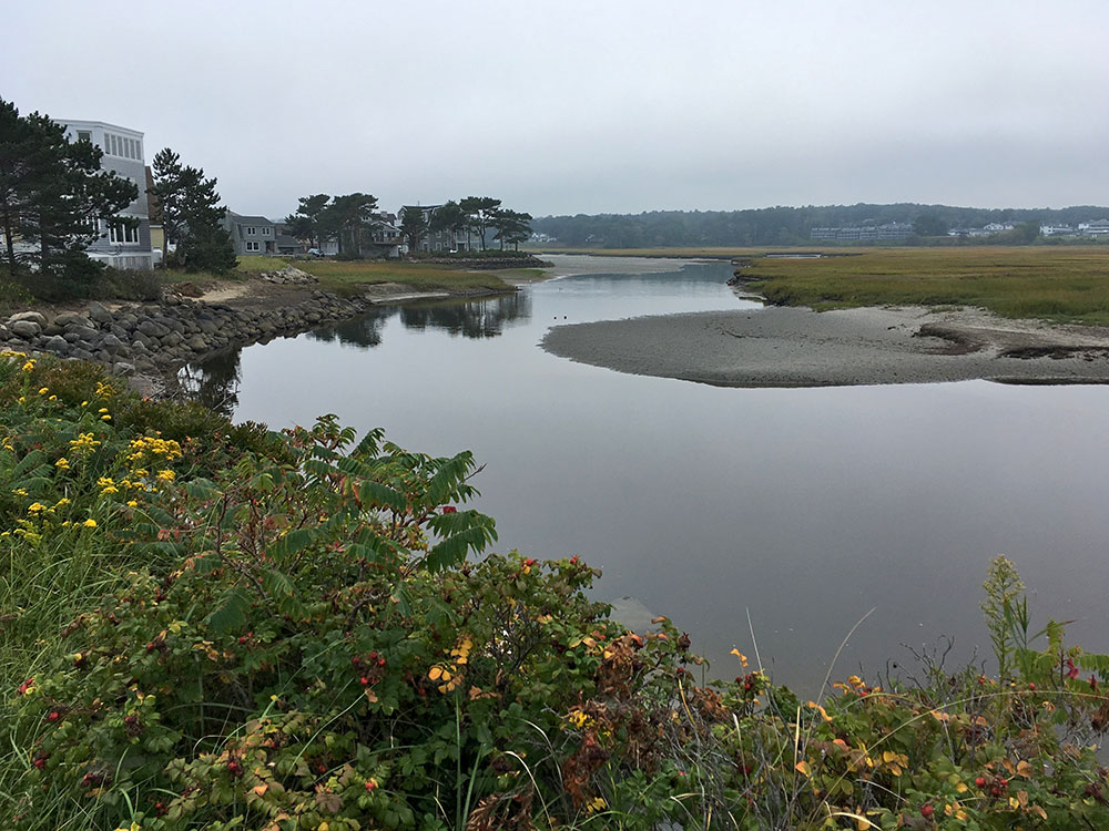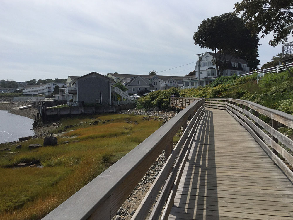 It includes a tidewater basin called Perkins Cove, spanned by a manually operated draw footbridge. The community has a three and a half-mile beach of pale sand and dunes forming a barrier peninsula, connected to the mainland in 1888 by bridge across the Ogunquit River. Marginal Way, a scenic trail dating back to the 1920s, runs along the coast from Perkins Cove to Ogunquit Beach.