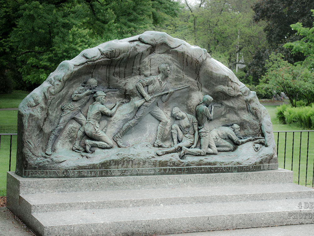 A bronze plaque, placed in 1910 by the Daughters of the American Revolution, marks the original location of the Old Belfry. The Belfry was moved several times before being destroyed by a gale in 1909. It was rebuilt the following year and is now located on a hill just south of the park. Near the western corner of the park stands what is considered the oldest memorial to the Revolution: the Revolutionary War Monument, a granite obelisk erected in 1799. In 1835, the remains of seven of the eight militiamen killed in the battle were exhumed from the nearby Old Burying Ground and reburied within the monument's iron fence. The monument also marks the approximate western end of the Patriot line. The line's eastern end is marked with an inscribed boulder.