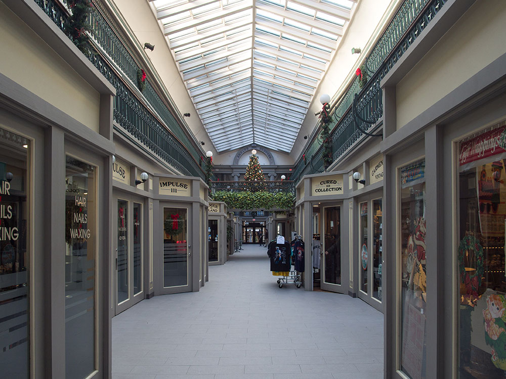 Historic shopping center in downtown Providence notable as the first enclosed shopping mall in the United States and as an example of commercial Greek Revival architecture