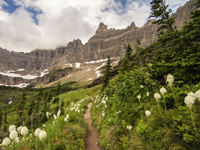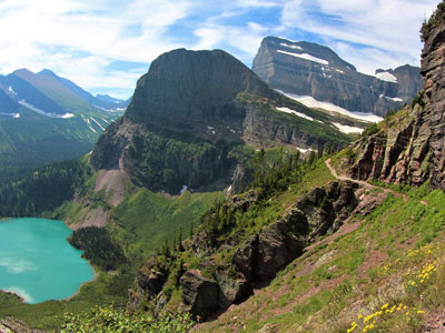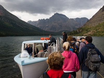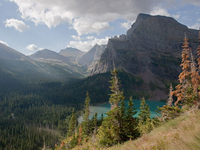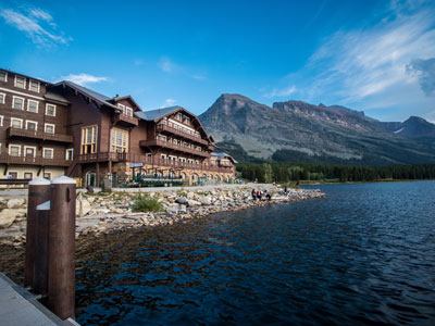 Many Glacier is an area within Glacier National Park located north of the Going-to-the-Sun Road, on the east side of the park. Lake Sherburne is the large lake in the area and the Many Glacier Hotel, the largest hotel within the park, is along the shore of the adjacent Swiftcurrent Lake. The Many Glacier Hotel and surrounding buildings are a National Historic Landmark, with original construction dating back to 1915. Many Glacier is surrounded by the high peaks of the Lewis Range, and numerous hiking trails can be accessed from the area. The region is noted for numerous lakes, waterfalls and dense coniferous forests interspersed with alpine meadows. Major sites in the immediate vicinity that can be accessed by trails include Lake Josephine, Grinnell Lake, Grinnell Glacier, Cracker Lake, Granite Park Chalet, Iceberg Cirque and the Ptarmigan Tunnel, which is a hiking tunnel carved through the mountainside during the 1930s. Tour boats allow visitors an opportunity to venture onto Swiftcurrent Lake. Other activities in the region include ranger guided nature hikes, horseback riding, fishing and camping.