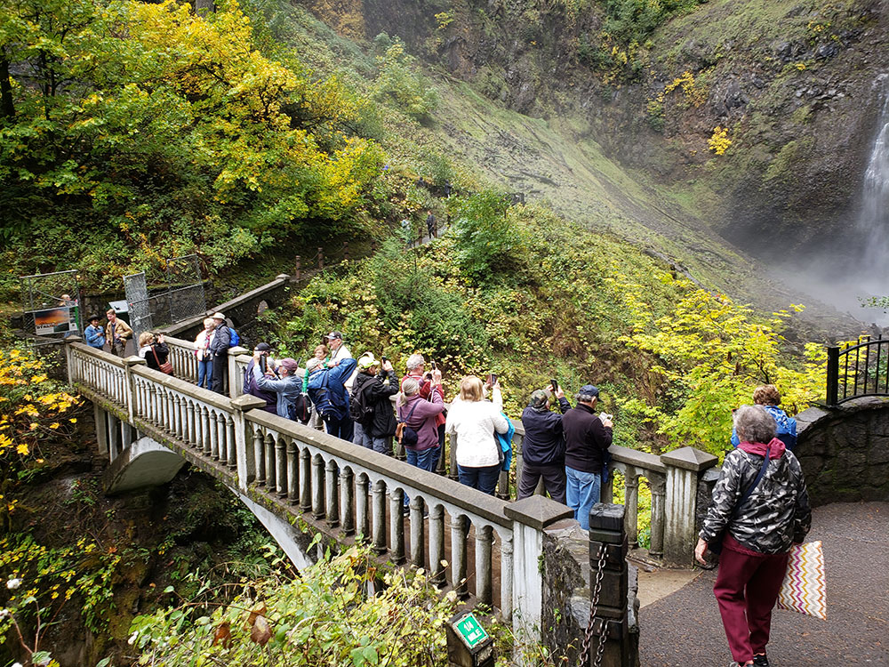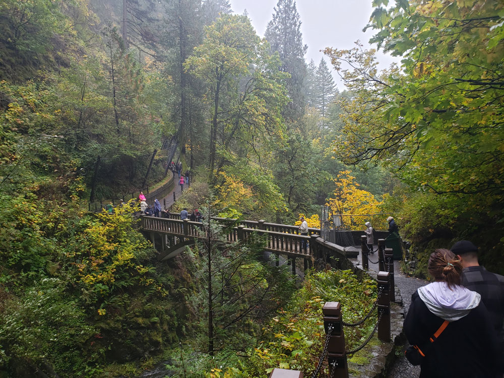 A paved foot trail leads to Benson Footbridge, a 45-foot (14 m)-long footbridge that allows visitors to cross 105 feet (32 m) above the lower cascade. After a viewpoint of the upper falls, the trail continues to ascend to an elevation of 785 feet (239 m); it consists of eleven switchbacks which reach a forested talus slope 100 feet (30 m) above the falls. The trail then descends to an observation deck (elevation 660 feet (200 m)) overlooking the falls' edge, providing visitors a bird's-eye view of the Columbia Gorge and also of "Little Multnomah", a small cascade slightly upstream from the "upper" falls, which is not visible from ground level.