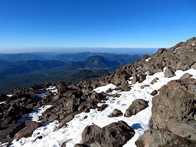 Above timberline, the route generally follows Monitor Ridge, climbing steeply through lava flows and loose pumice and ash. From timberline the route is marked with large wooden posts to about 7,000 feet elevation. The upper 1,300 feet of the route is unmarked and covered with loose, rock, pumice and ash. On your descent, take care to stay on route. A minor detour may put you far off route at timberline.