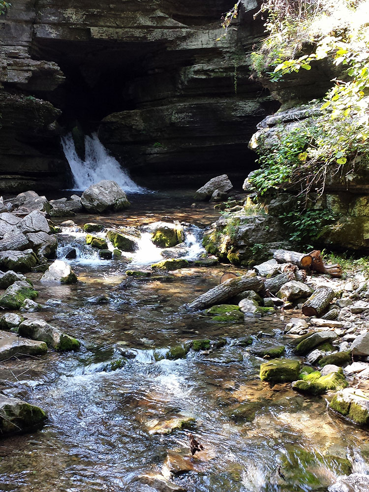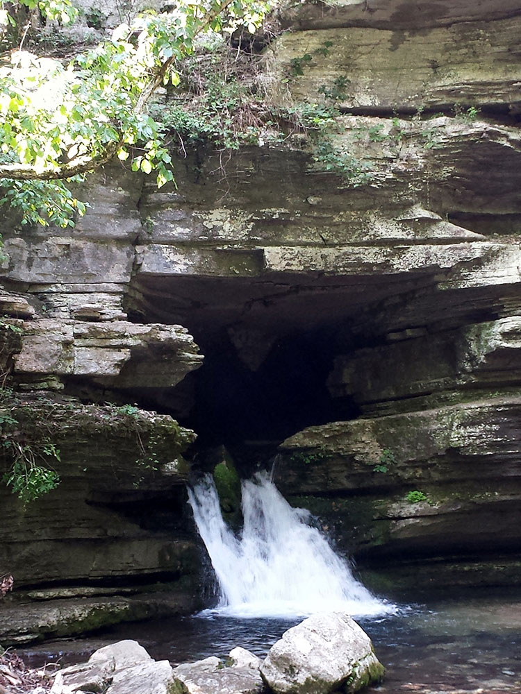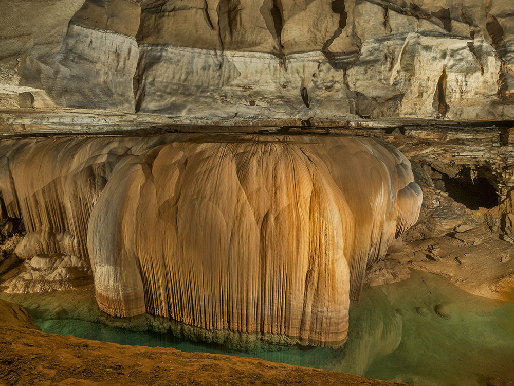 With 8.1 miles of surveyed passage, Blanchard is the second longest cave in Arkansas and the largest in volume. The limestone rock from which the caves and their formations developed was laid down in an ancient sea more than 350 million years ago. The cave is in middle Ordovician to lower Mississippian rocks and extends through six stratigraphic formations. The cave has shown over 5 levels of passage development but the upper two levels have eroded away as deepening valleys on the surface cut into them. The cave's formation was largely phreatic in nature (formed below the water table) and passages have elliptical cross-sections typical of these formations. During the cave's development, active streams have been pirated from one level down to another without much vadose erosion occurring. The present stream currently rises from the cave at Blanchard Springs itself, at the same temperature as the cave, a constant, year-round 58 °F (14 °C). Most of the lower-level Discovery Route is in the approximately 100-foot thick Plattin limestone whereas the Dripstone tour route in the uppermost level of the cave spans 3 units, the Boone Chert, Cason Shale, and the Fernvale Limestone. Blanchard remains a "living" cave in part because of the care given by visitors and the United States Forest Service. Thus the formations inside continue to grow as calcite is actively deposited by seeping and dripping water. One of the outstanding examples of formation growth is the Giant Flowstone, one of the largest in the U.S., at 164 feet long, 33 feet wide, and 30 feet thick.