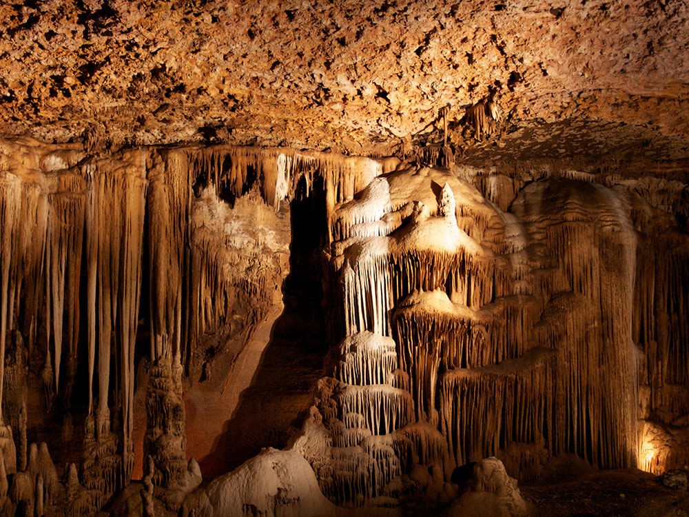 Residents knew about the cave by the 1930s and called it Half-Mile Cave. Systematic explorations began in the 1950s and continued sporadically through the 1960s. Explorers discovered a skeleton in the cave in 1955 which were incomplete; a cause of death could not be ascertained. The caverns were opened to the public in 1973 after 10 years of development on the Dripstone Trail.