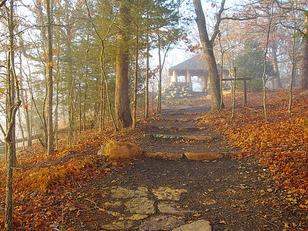 Vista Point Trail is 9 miles (14 km) long. It follows Gorley King Trail for 1.5 miles (2.4 km). Then it ascends Holt Ridge and heads out onto the plateau in Ozark National Forest. Here it passes a quarry that was used by the CCC to build some of the facilities at Devil's Den State Park. Next it ascends Mount Olive and crosses the Butterfield Hiking Trail. Vista Point Trail loops back through the national forest and towards the park, passing a 19th-century homestead and the Vista Point Overlook before returning to the park following part of the Gorley King Trail back to the horse camp.