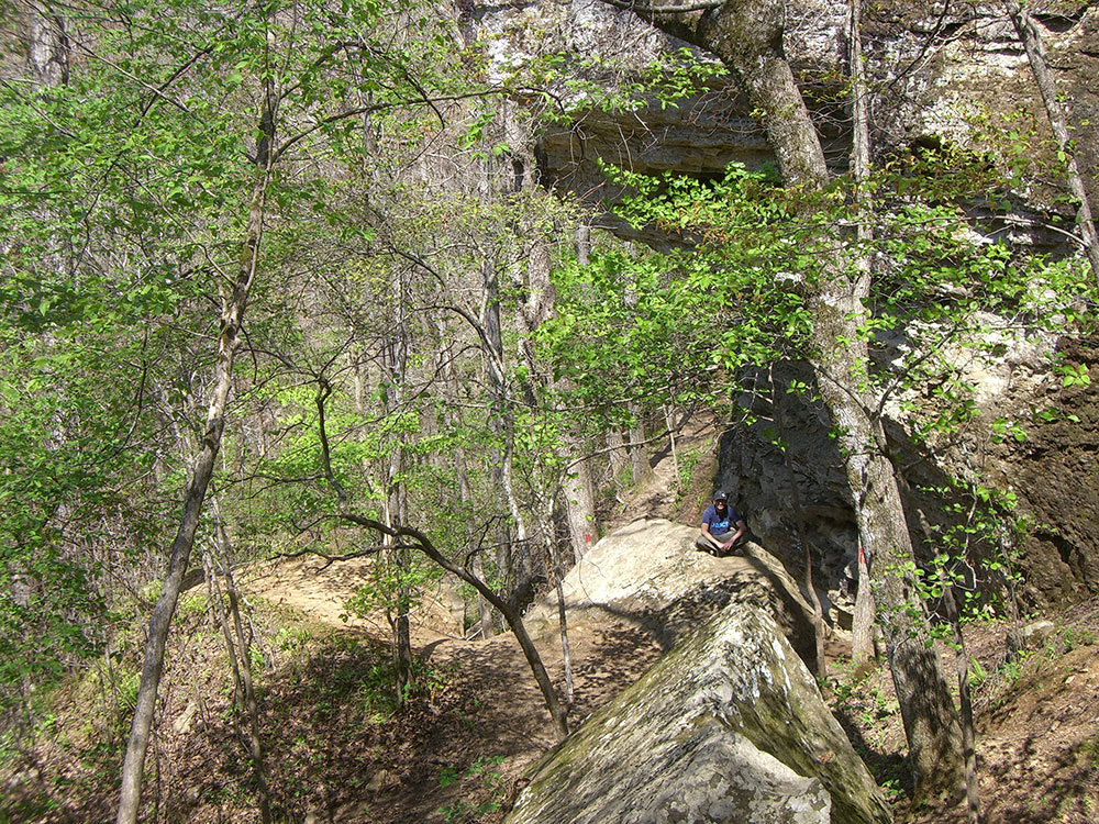Yellow Rock Trail is 3 miles (4.8 km) long. Users will hike 300 feet (91 m) in elevation to one of the best views in the park. Atop the Yellow Rock is an unobstructed view of the Lee Creek valley. Along the rest of the trail users enjoy cedar glades, interesting rock formations, and the first structure built in the park.