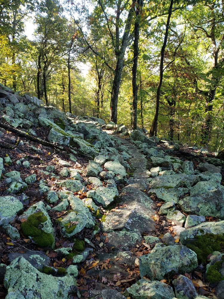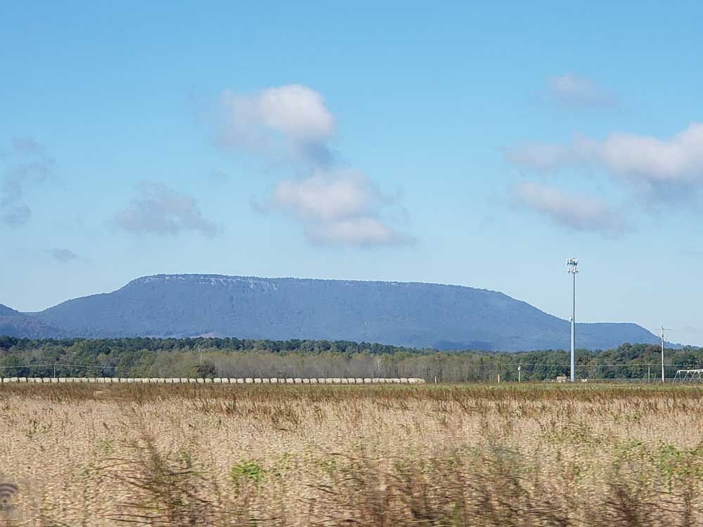 Mount Nebo is a flat-topped mountain about 5 miles (8.0 km) west of the city of Dardanelle, from which it is accessed by Arkansas Highway 155. The mountaintop is roughly in the shape of an apostrophe or teardrop, with a point at its northwesterly tip, and a wide south-facing base, from which curving sides trend north to northwest. A few hundred feet below the summit is a "bench", or slightly wider terrace, from which the shoulders of the mount slope steeply down to the valley floor. The bench is impervious to water so rainwater percolating down through the soil builds up in the underlying pockets and results in the numerous springs found on the Bench Trail.