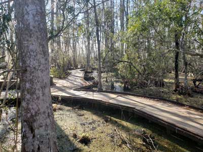 0.8 miles, 40 feetGiant live oaks, Bayou Coquille, American Indian shell mound, the "Monarch of the Swamp" (600-year-old baldcypress tree), seasonal wildflowers, cell phone tour, trailside signs with information on history and nature