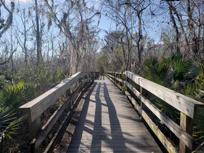 Seating area under baldcypress area near beginning of trail, freshwater flotant marsh view at trail's end