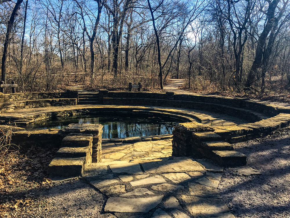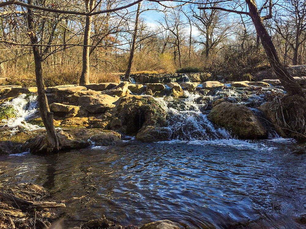 Travertine district, embracing the old Platt National Park, is three miles long and less than one mile wide. A narrow road circles the district, passing by parking areas, camp and picnic grounds, the Travertine Nature Center, swimming holes, springs, and a bison pasture. Travertine Creek, joined by Rock Creek, flows through the district, rising in Antelope Springs and Buffalo Springs at the eastern end of the park. The springs produce 5 million gallons per day (20 million liters) of cool, crystal clear-water and form Travertine Creek which is joined by Rock Creek about 2 miles from its source. A number of other fresh water and mineral springs contribute to Travertine and Rock Creek as they flow through Travertine District, dropping in small waterfalls over several ledges. Several miles of walking and biking trails wind through the heavily forested creek bottomland.