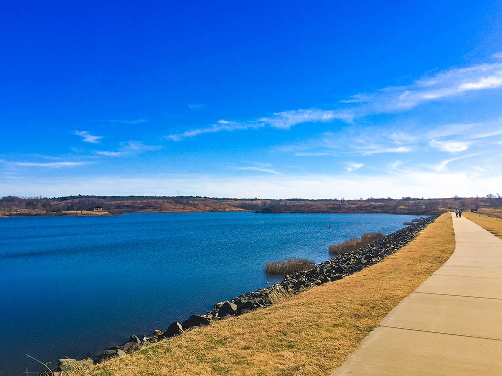 Most of the National Recreational Area is taken up by the 2,350 acre (950 ha) Lake of the Arbuckles and the prairie and woodland along its shores. Lake of the Arbuckles was built by the Bureau of Reclamation in 1966 by impounding Rock Creek. The lake features 36 miles of shoreline. Fishing is permitted year-round for crappie, catfish, largemouth bass, white bass and bluegill. Facilities include three campgrounds for tents and RVs, picnic areas, public restrooms, boat docks and ramps, and several miles of multi-use trails.