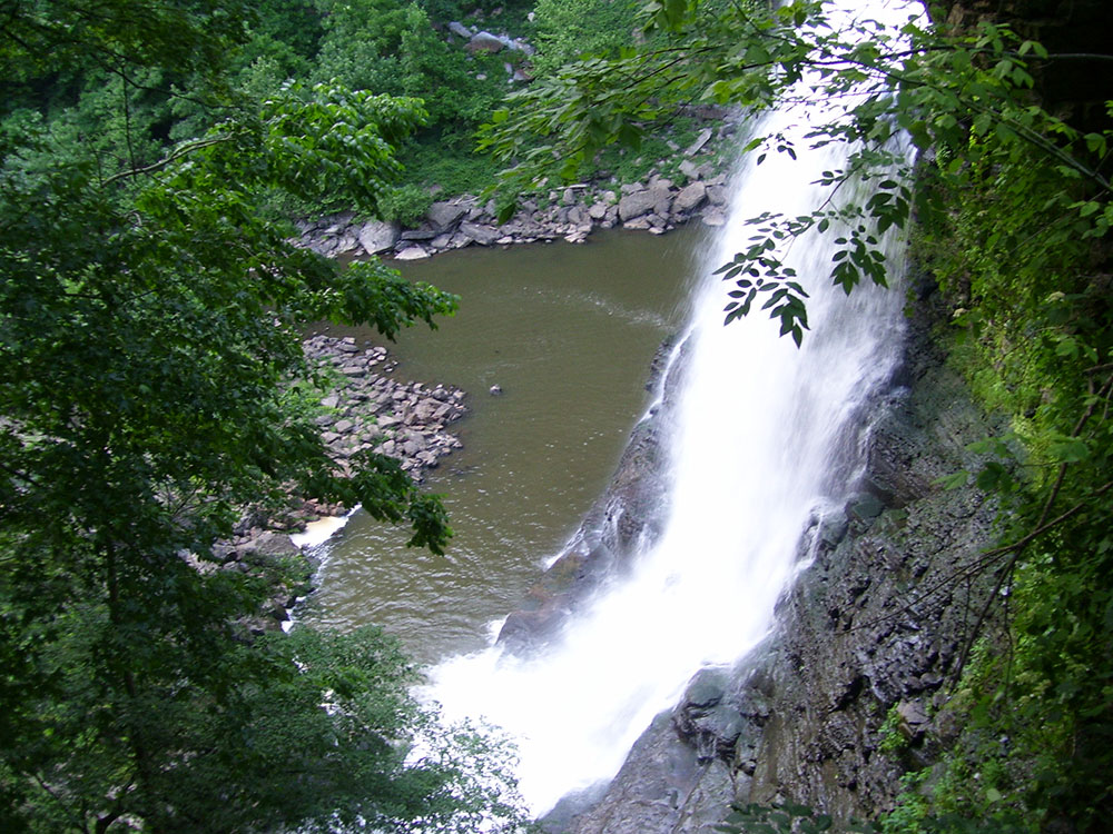 Over a long period of time, the Falling Water River's rapids have cut a deep gorge just above its mouth. The river drops to the Central Basin in a series of cascades and waterfalls, each gaining in size and intensity as the river approaches Center Hill Lake. At the Falling Water Cascades, located just downstream from the old Burgess Falls Dam, the river gradually spills over a 10-foot (3.0 m) embankment of rocks. Almost immediately downstream from the Cascades, the river drops another 30 feet (9.1 m) at Little Falls. Beyond Little Falls, where the river briefly bends to the north, is an 80-foot (24 m) cascade known as Middle Falls. Downstream from Middle Falls, where the river bends westward again, is the 136-foot (41 m) Burgess Falls. The distance between Falling Water Cascades and Burgess Falls is less than a mile. Burgess Falls spills into a large limestone gorge enclosed by sheer walls 100-200 feet (30-60 m) high. The Falling Water River enters Center Hill Lake downstream from Burgess Falls.