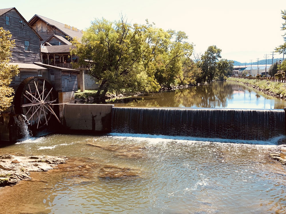 Pigeon Forge Mill: Listed on the National Register of Historic Places in 1975, this working gristmill, also known as Old Mill, is on the West Fork of the Little Pigeon River (along its east bank), and is accessible via Old Mill Drive (which intersects the Parkway at Light #7). The site includes a millhouse, milldam, and breastshot wheel.