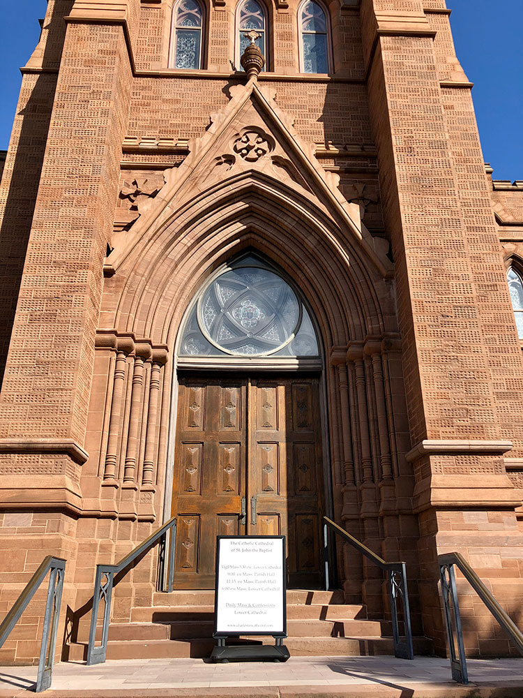 The first brownstone cathedral was built in 1854 and named the Cathedral of Saint John and Saint Finbar. It burned in a great fire in December 1861. The rebuilt cathedral was named for St. John the Baptist and was constructed on the foundations of the earlier structure. Architect Patrick Keely designed both the original cathedral and its replacement.