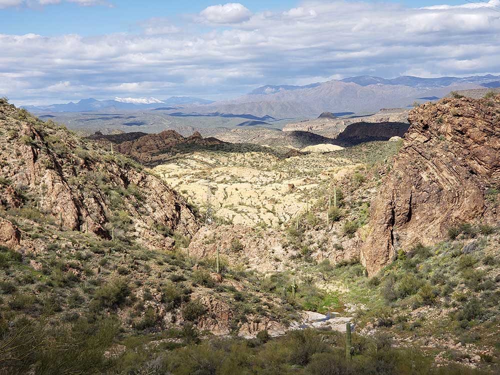 The scenic byway was designated in 1998, and is approximately 39 miles long, winding in and out of some of the most awe-inspiring country in Arizona--or for that matter, in the West. It is bound on the north by Canyon and Apache lakes, and on the south by the rugged Superstition Mountains and the Superstition Mountain Wilderness Area.