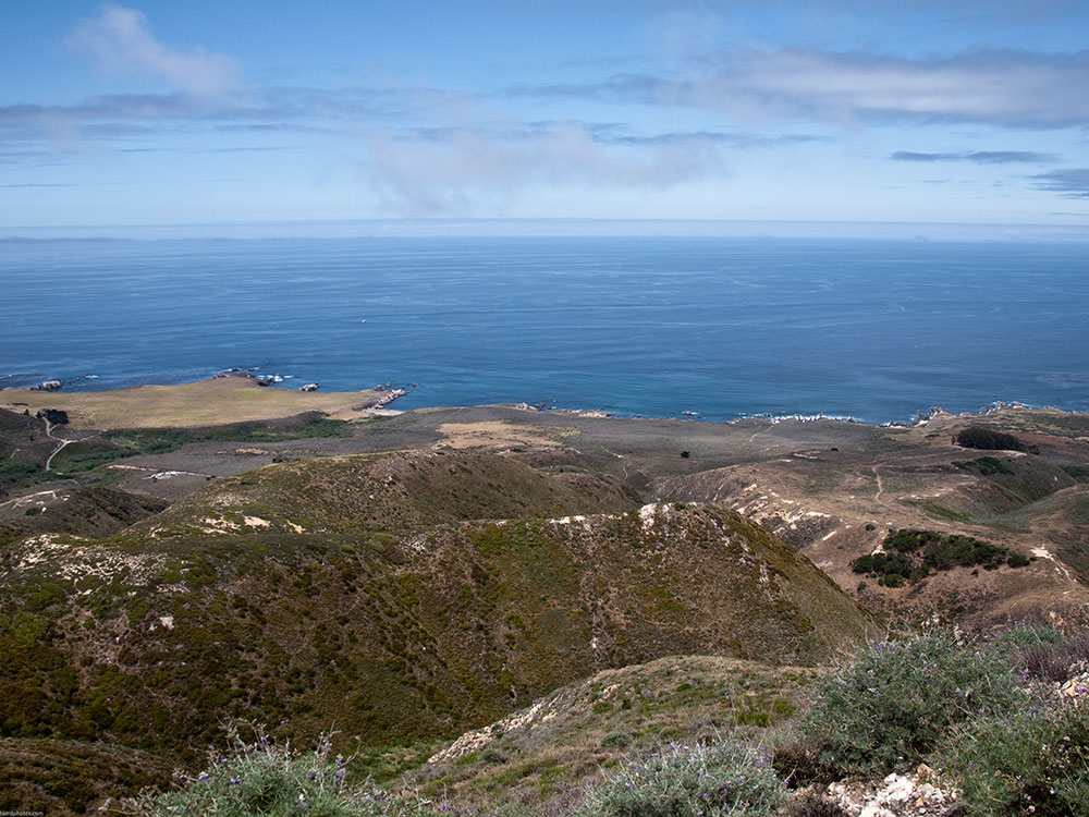 Scenic summit trail ascending coastal ridges to panoramic views of ocean bluffs, inland peaks, and wildflower-covered hillsides.