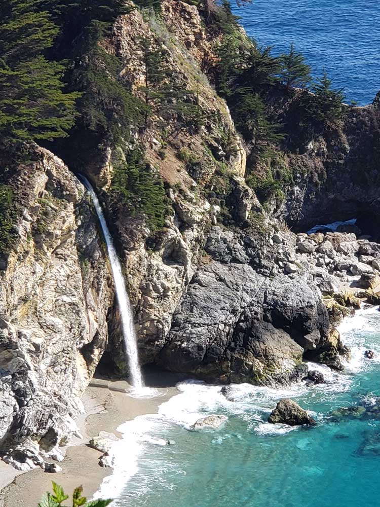 McWay Falls is an 80-foot-tall (24 m) waterfall on the coast of Big Sur in central California that flows year-round from McWay Creek in Julia Pfeiffer Burns State Park, about 37 miles (60 km) south of Carmel, into the Pacific Ocean. During high tide, it is a tidefall, a waterfall that empties directly into the ocean. The only other tidefall in California is Alamere Falls.
