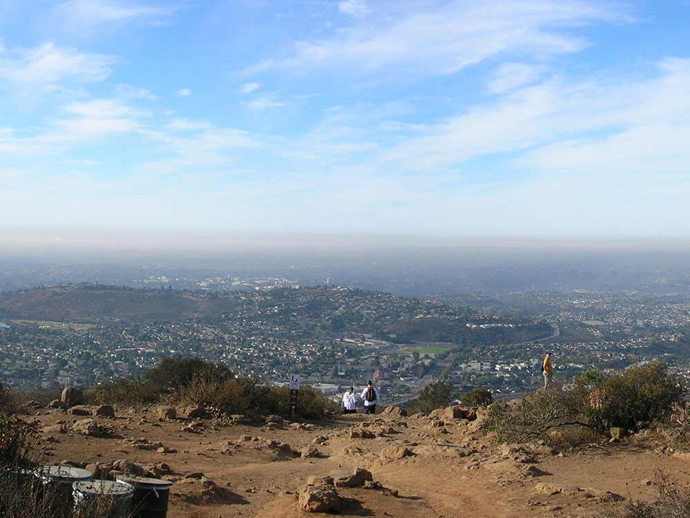 The main trail to the summit is a popular hiking destination taking hikers to a 360-degree panorama of San Diego County. The hike to the top is 1.5 miles (2.4 km) long and an elevation change of about 950 feet (290 m). This trail is on the corner of Golfcrest Drive and Navajo Road. A much-less-used but maintained trail begins near the intersection of Boulder Lake Avenue and Barker way. This trail meets the main trail near the summit.