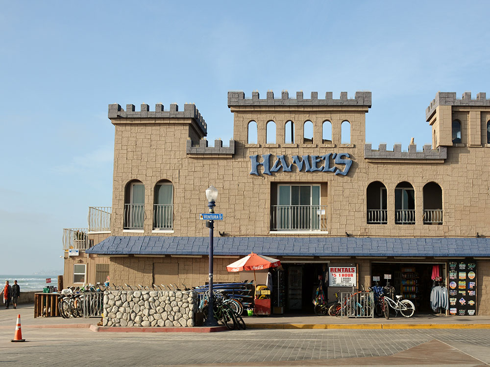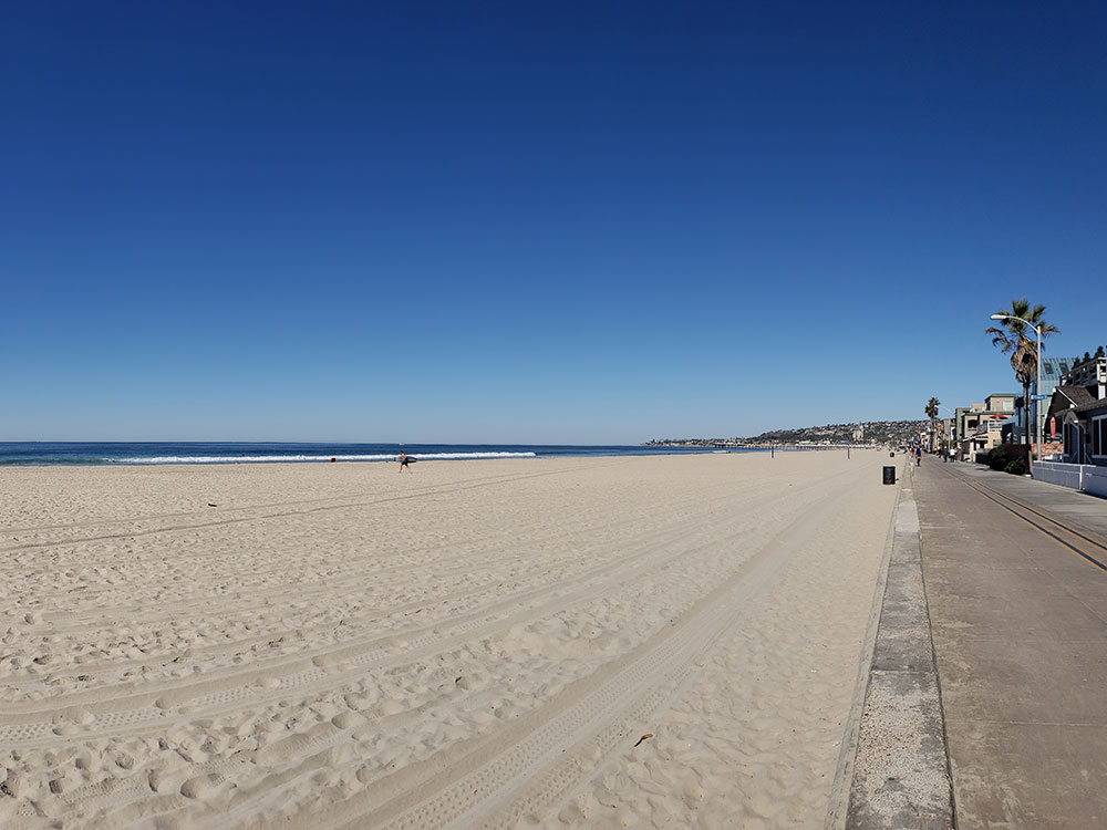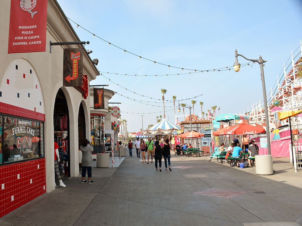 Community built on a sandbar between the Pacific Ocean and Mission Bay, spanning nearly two miles of ocean front, with a boardwalk running along the beaches on both the ocean and bay sides of the community